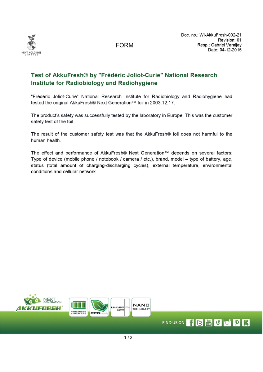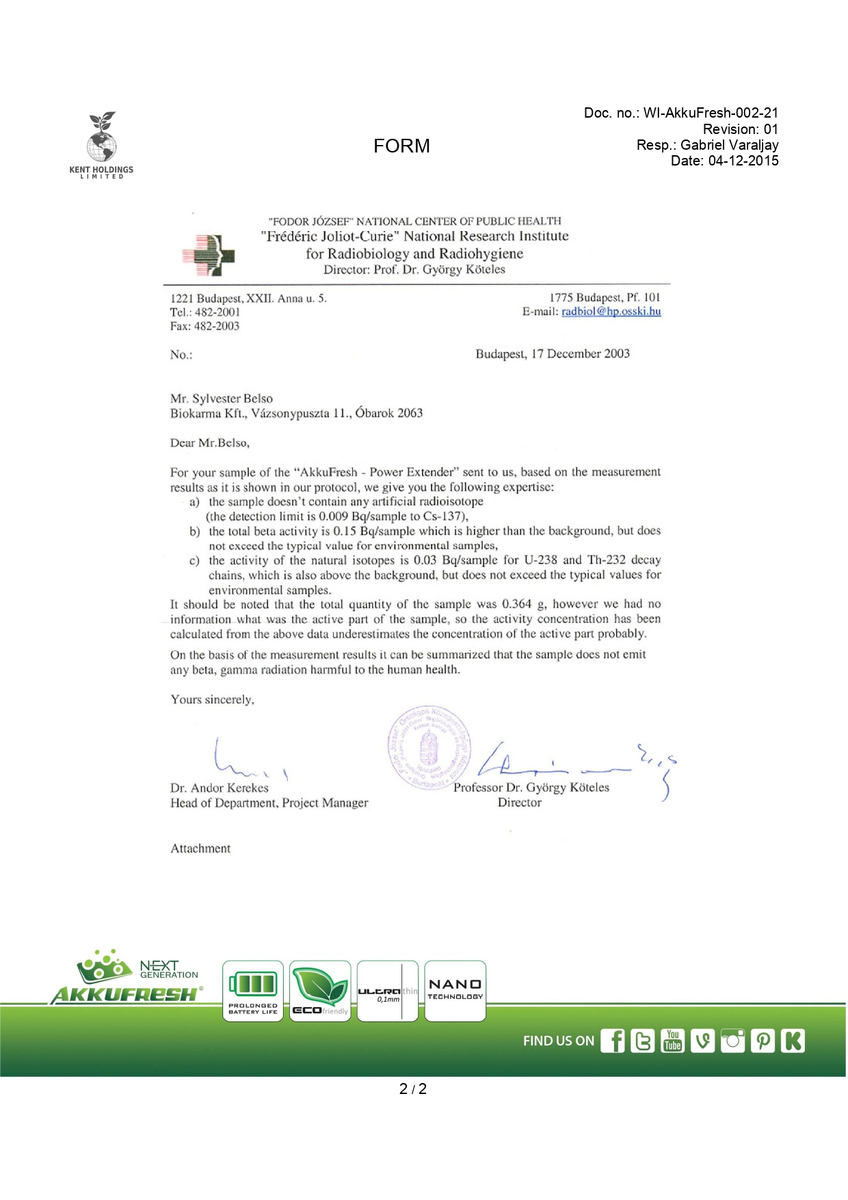 Test of AkkuFresh® by "Frédéric Joliot-Curie" National Research Institute for Radiobiology and Radiohygiene